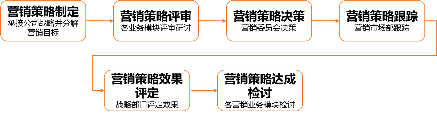 以上是营销策略制定与实施流程,本流程作为承接企业整体经营战略的流程,以及指导营销模块业务工作的方向流程,是非常重要的。任何一个业务模块都是为企业整体经营目标服务的,有了这个流程后,整个营销模块业务架构才有明确的目标。