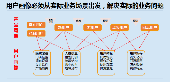 3、 总结来说,用户画像必须从实际业务场景出发,解决实际的业务问题,之所以进行用户画像,要么是获取新用户,要么是提升用户体验、或者挽回流失用户等具有明确的业务目标。
