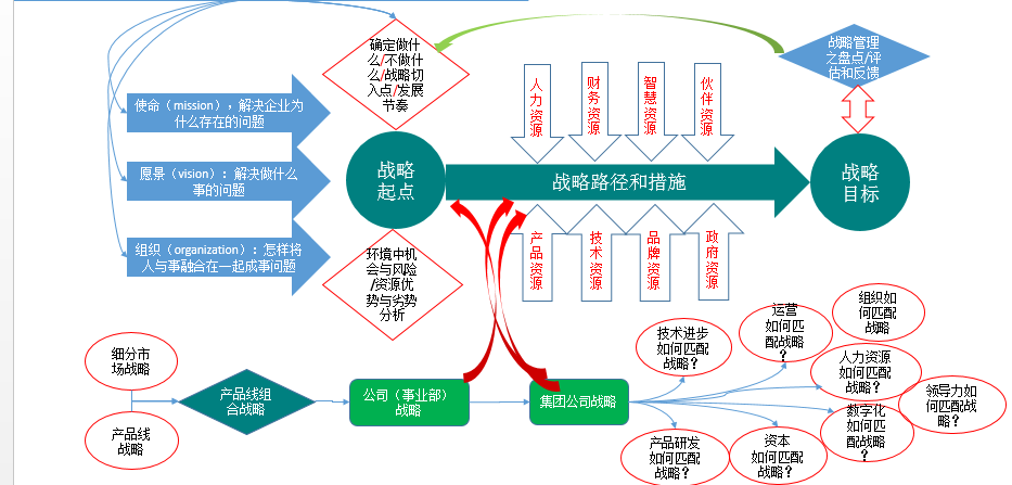(2)战略实现路径和关键措施。战略定位和路径确定后,就要按照战略进行资源配置,包括人力资源、产品资源、资金资源、技术资源、政府资源、伙伴资源、智慧资源配置。