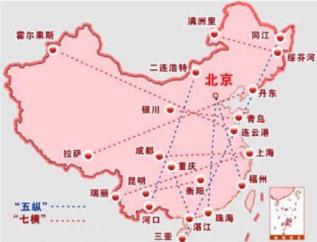 下面两张图是国家高速公路“五纵七横”规划图,这就是公路网络的主干线。这几个主干线设计、建设、管理的好坏,直接影响全国物流、人流、商流、信息流的整体结构性效率。大家要注意,这个规划的核心是着眼于全国物流效率,而非关注某一个省市的物流效率。