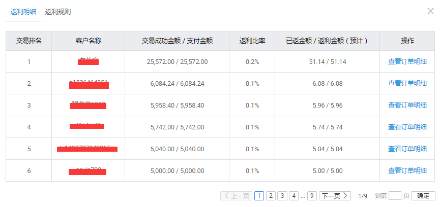 可以设置不返利客户,也可以把返利规则设置成三档及金额是多少、返利是多少(依据自己行业的利润而定);也可以选择不返利商品。如果设置好的返利客户,在后台看到设置金额及返利金额可以一目了然。如图9-7所示。