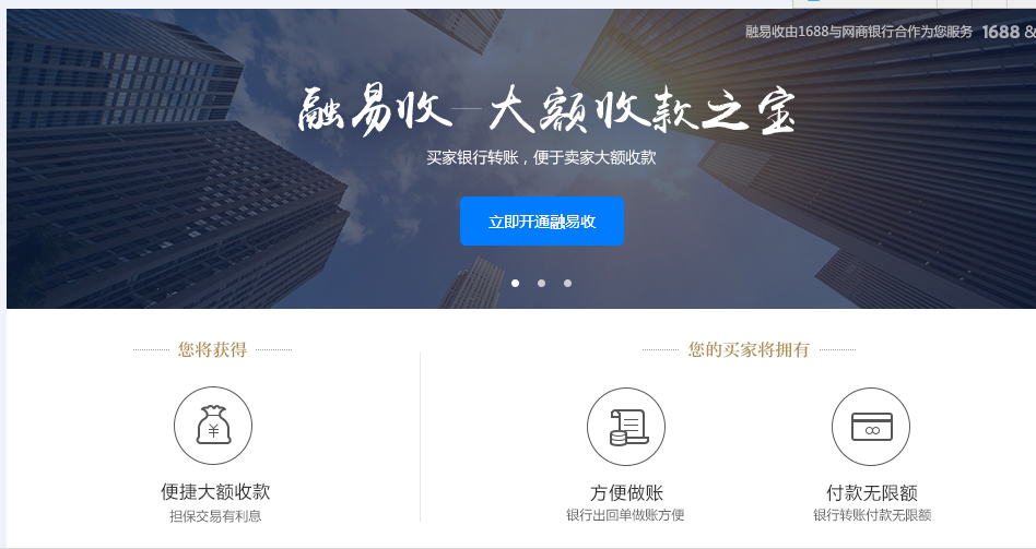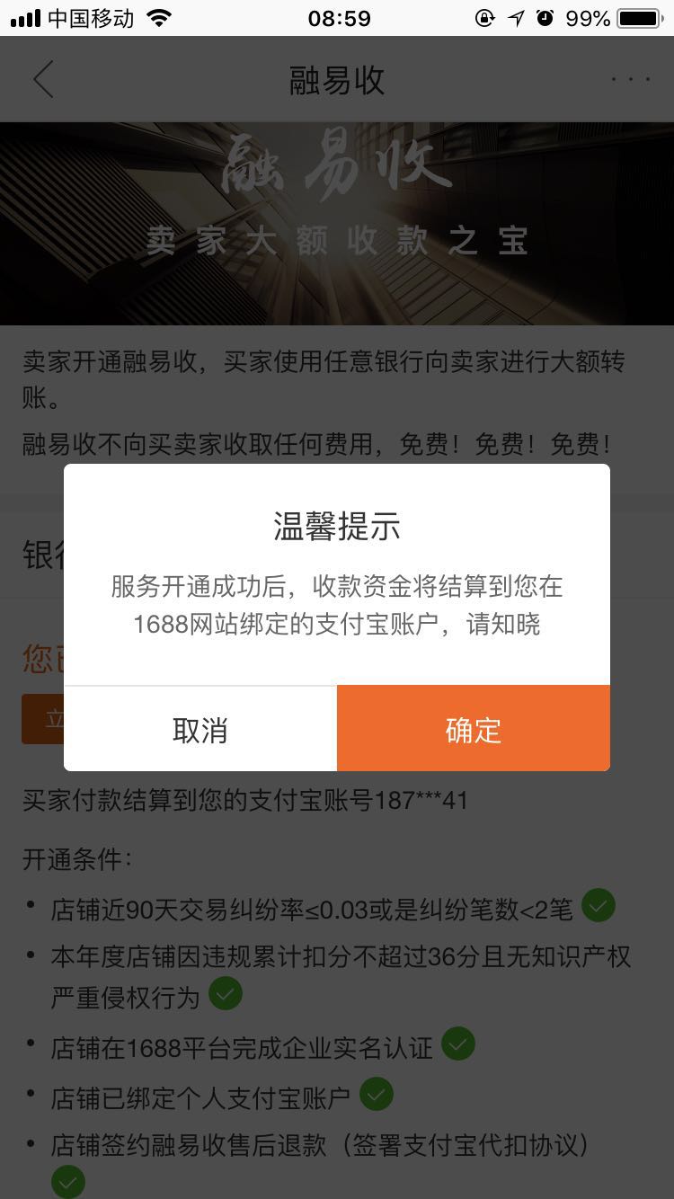 这里就不一一详细阐述了,都在后台我的阿里——交易方式——融易收、账期支付、货到付款等。这里有几个地方需要说明,第一个就是融易收,融易收建议开通,有利于大额交易,具体路径为: