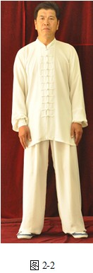 (1)意念放松:两膝微屈,与涌泉穴垂直,抬左脚平行拉开,与肩同宽,两臂自然下垂,掌心贴近股骨外侧,手中指指尖靠近风市穴。头顶正直,舌抵上腭,下额微收,两眼微闭,唇齿微合,自然呼吸。