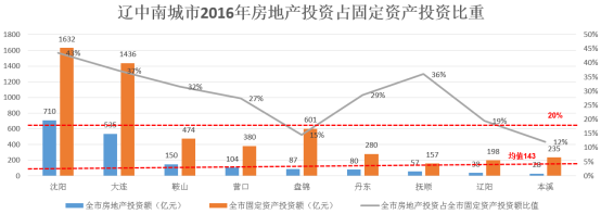 2016年辽中南城市群房地产投资额为1789亿元,占全国房地产投资额135284亿元的1.32%;房地产投资额在均值143亿元以上的城市有3个,分别是沈阳、大连、鞍山。房地产投资占固定资产投资比重超过25%的有6个,分别为沈阳、大连、鞍山、营口、丹东、抚顺,此区域房地产投资相对过热,建议谨慎拿地;介于15%至25%的有2个,分别为盘锦、辽阳,此区域为房地产合理投资区,建议重点关注;在15%以下的城市有1个,此区域房地产投资相对较少,存在潜在投资机会。