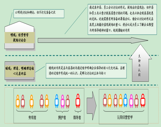 “明线”是指通过漏斗型经营哲学提炼工具获得的经营哲学初稿,在高层中没有形成明确的主张,而是在高中基层会议上群策群力地进一步的讨论、提炼,通过会议和研讨引导中基层员工与高层想法一致,逐步达到共识。