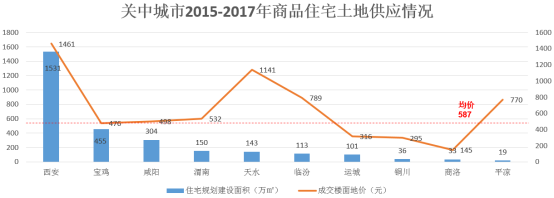 关中城市群10个城市2015-2017年三年平均土地出让住宅总建设面积为2887万平米,平均成交楼面均价为587元/㎡。