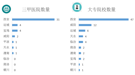 从最直接影响房地产的医疗教育配套来看,关中城市群中三甲医院共有44所,占全国三甲医院总数1599所的3%;大专院校81所,占全国大专院校总数2631所的3%。