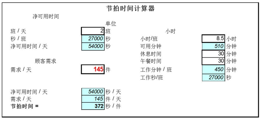 节拍时间是指在一定时间区间内,总有效生产时间与客户需求数量的比值,是客户需求一件产品的所需要的时间。