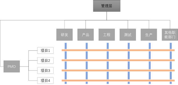 该结构与矩阵式结构的最大区别是,公司有一个固定的机构即PMO来辅助协调项目的实施。本文所探讨的PMO大多以此类型组织架构为基础。