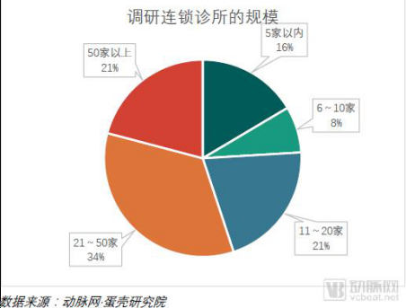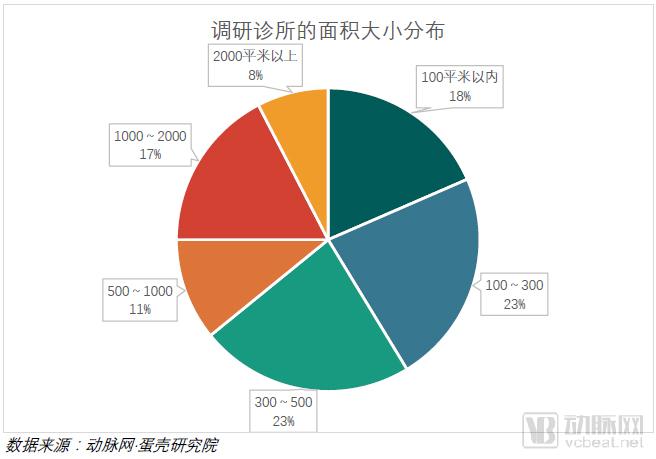 面积小于100平方米的诊所,全部是定位于社区医疗服务的个体诊所。这类诊所的竞争力差,在蛋壳研究院所调研的诊所中占到了18%(图1-10)。1000平方米以上的中大型诊所,合计占到了所调研诊所的25%。这类诊所一般设置的科室较多,能够为患者提供比较全面的医疗服务。诊所的面积较大,能够布置的空间也更多,在等候区、留观区的装修设计也会更漂亮。
