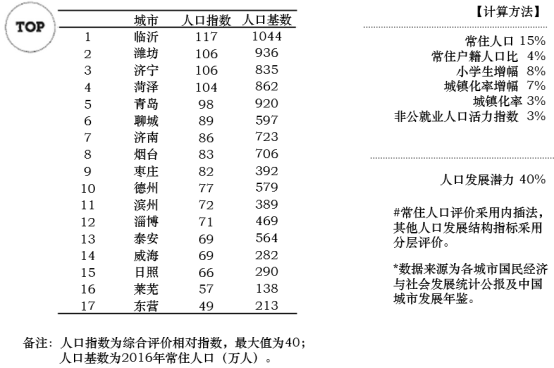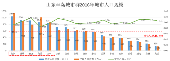 从人口总量看,山东半岛城市群常住户籍人口比为 1.02,人口流动相对稳定。常住户籍人口比≥ 1.02的城市有8个,分别为青岛、济南、东营、威海、淄博、烟台、莱芜、潍坊。从人口分布看,常住人口超过800万人的城市有5个,分别为临沂、潍坊、青岛、菏泽、济宁;常住人口500万至800万的城市有5个,分别为济南、烟台、聊城、德州、泰安。山东人口生育意愿较强烈,2016年山东出生率17.89‰,高于全国出生率12.95‰;人口自然增长率10.84‰,高于全国自然增长率5.86‰。