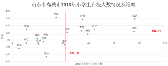 从小学生2016年在校生人数看,山东半岛城市群2016年小学生在校人数为691万人,占全国小学生在校人数9913万人的6.97%。相对山东半岛城市群占全国总人口比重7.2%,人口结构相对合理;山东半岛城市群17个城市小学生在校生人数五年总涨幅为7%;小学生人数较多且增幅较高的城市有7个,分别是:临沂、菏泽、济宁、聊城、青岛、潍坊、济南。