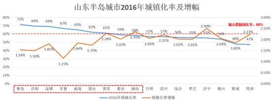 山东半岛城市群17个城市城镇化率在均值60%以上的城市共7个,超过全国平均水平57.4%的城市共9个,已经达到2020年目标城镇化率65%以上的城市共5个,分别为青岛、济南、淄博、东营、威海。17个城市2016年城镇化率增幅在1.15%-2.50%之间,增幅均值为1.95%,按照现有增幅均值情况估算,2020年城镇化率可达到63.9%。