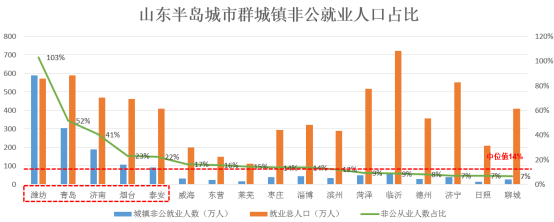 非公就业人口占比体现城市经济的活力和可持续性。山东半岛城市群城市非公就业人口占比中位值为14%,高于20%的城市有潍坊、青岛、济南、烟台、泰安,这些城市非公就业人口活力较强