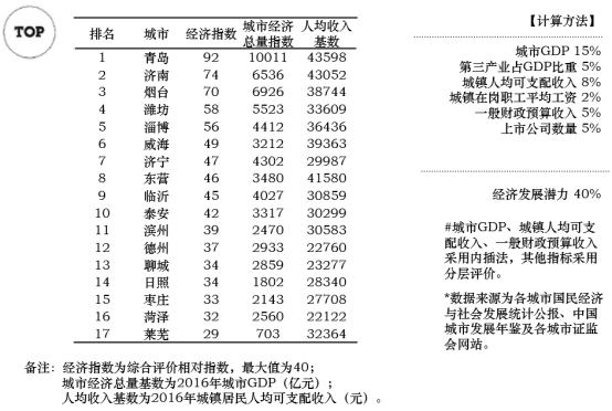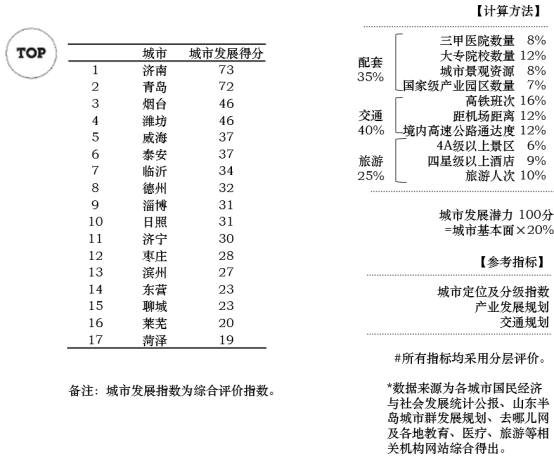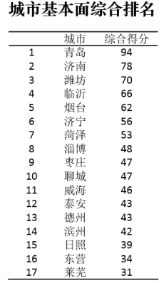 山东半岛城市群城市基本面综合排名TOP3的城市为:济南、青岛、烟台。处在城市发展较好区、适中区、较差区的城市个数比为3:11:3。