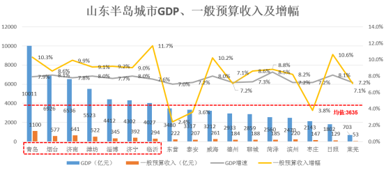 山东半岛城市群17个城市中GDP超过均值3635亿元的共有7个,超过4000亿的有7个,分别为:青岛、烟台、济南、潍坊、淄博、济宁、临沂,其中烟台、济宁、潍坊超过5000亿,青岛超过10000亿。山东半岛城市群一般预算收入的均值为278亿元,高于均值的城市共有7个,分别为:青岛、烟台、济南、潍坊、淄博、济宁、临沂。
