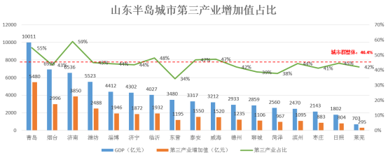 山东半岛城市群整体第三产业增加值占GDP比重为46.4%,低于全国51.6%的平均水平;从产业发展潜力看,17个城市中,城市第三产业占GDP比重>城市群整体占比46.4%的有5个,分别为济南、青岛、临沂、威海、泰安,其中,济南和青岛超过50%。
