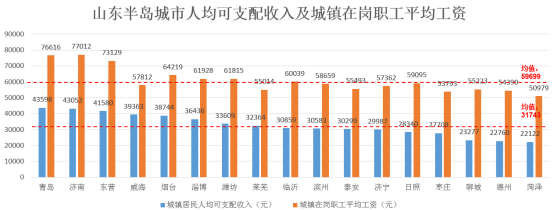 城市群人均城镇居民可支配收入为31743元, 其中6个城市高于全国人均城镇居民可支配收入33616元,8个城市高于城市群均值31743元,分别为青岛、济南、东营、威海、烟台、淄博、潍坊、莱芜。城市群城镇在岗职工平均工资的均值为59699元,超过均值的城市共有7个,分别为:青岛、济南、东营、烟台、淄博、潍坊、临沂。