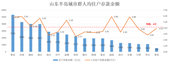 山东半岛城市群整体人均住户存款余额为4万元,高于整体水平的城市有7个,分别为青岛、济南、潍坊、烟台、淄博、威海、东营。