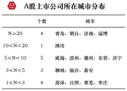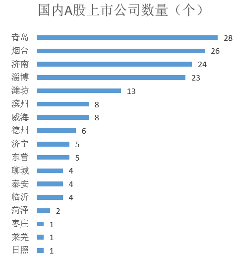 上市公司数量的多少是反映一个城市经济活力的重要指针。山东半岛城市群A股上市公司数量相对较少,10家以上的仅有5个城市,青岛、烟台、济南、淄博、潍坊等城市经济活力较强。