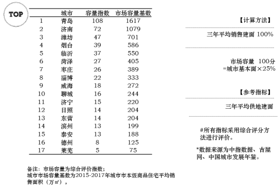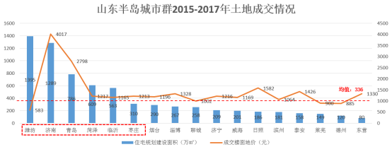 山东半岛城市群城市市场容量基数均值为353万㎡ 。市场容量及安全指数TOP3的城市为:青岛、济南、潍坊。