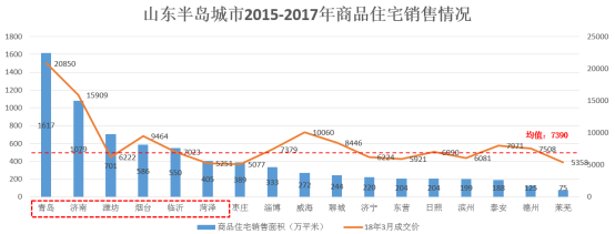 山东半岛城市群17个城市2015-2017年商品住宅市场平均年成交面积为7390万㎡;青岛、济南商品住宅成交面积分别为1617、1079万㎡,占整个山东半岛城市群成交总量的21.9%、14.6%。商品住宅成交面积在400万㎡以上的城市有6个,分别为青岛、济南、潍坊、烟台、临沂、菏泽。