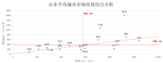 市场容量从商品住宅销售面积和常住人口两个维度考虑。人口规模较大且距离轴线向下偏离越大代表市场潜在容量越大。重点关注城市有济宁、德州、泰安、聊城、莱芜;一般关注城市菏泽、临沂。