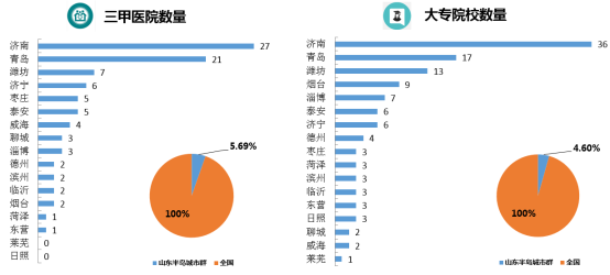 从最直接影响房地产的医疗教育配套来看,山东半岛城市群共有三甲医院91所,占全国三甲医院总数1599所的5.69%;共有大专院校121所,占全国大专院校总数2631所的4.6%;相较于山东半岛城市群人口总数占全国的7.2%,整体配套一般;但济南、青岛、潍坊三个城市配套较好。