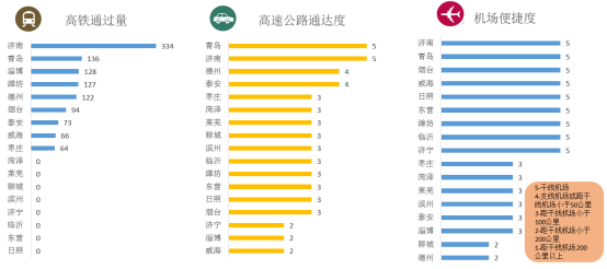 山东半岛城市群中济南、青岛的交通便利度明显优于其他城市。