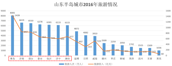 旅游反映了城市休闲配套资源情况和因旅游带来的短时流动人口流向。山东半岛城市群2016年旅游人次达7.14亿人,旅游收入8010亿元;其中,青岛、济南、烟台、泰安、临沂、济宁、潍坊等城市旅游人次均超过6000万,为重要的旅游城市。