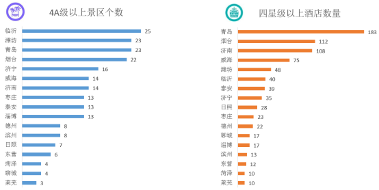 山东半岛城市群共有4A级以上景区216个,占全国4A级以上景区1335个的16.2%,其中,临沂、青岛、潍坊、烟台均超过20个。四星级以上酒店792个,青岛、烟台、济南超过100个,威海、潍坊、临沂、泰安、济宁均超过30个。