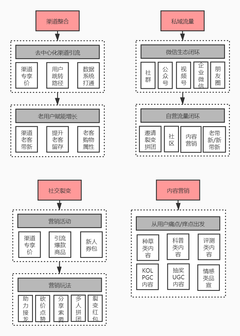 渠道整合特指当前企业已有的成熟渠道,例如公众号矩阵、小程序矩阵等已经有存量用户的渠道。这个环节我们重点需要关注的是如何高效地往目标平台导流。