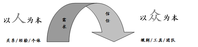 从一个“人”到三个“人”的“众”,也就是从个人到团队。,三个人要形成一个团队,必须有一定的规则和工具。“以众为本”,也就是以规则和工具为主导、以团队为主体来展开工业品营销,其核心是构建基于信任导向的中国特色工业品营销管理体系。工业品营销要实现从“以人为本”向“以众为本”的转变,必须要在以下三大方面努力。