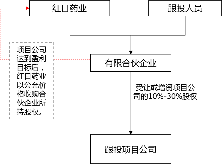 红日药业专门设立事业合伙人计划领导小组,负责把握计划的实施进度,审议合伙人计划方案,决定合伙人人选及其份额。红日药业的事业合伙人计划本质是“项目跟投”。以核心管理人员、技术人员为主的团队通过增资或受让部分股权的方式,持有项目公司股权,成为项目公司的合伙人股东。合伙人所持的项目公司股权,在未来项目公司达到更高的盈利水平后,由红日药业按照相关证券法规所许可的方式,以公允价格收购,合伙人实现价值回报。