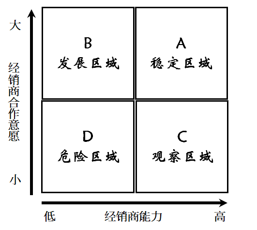 是否还有继续合作的必要?厂家需要有评判的标准。厂家按照绩效评估标准,对经销商进行定期评估,将被评估的经销商按状态分为:绿灯——理想状况、黄灯——有待改善,红灯——低于标准,然后对不同状态的经销商采取正向激励、绩效改进、惩罚措施。绩效评估不仅要评估短期目标还要评估长期目标,不仅要评估结果还要评估过程,不仅要评估能力还要评估态度。经销商绩效评估标准由结果、能力、意愿三个维度组成。