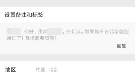 首先,以地域作为聊天门槛,给人留下的印象往往是自大。很多群聊里的成员来自四面八方,所以这样的验证请求很难让人接受。另外,这段验证请求中已经表明加好友的目的是为了交流资源,却不具体说明自己有何资源,难以打动人。