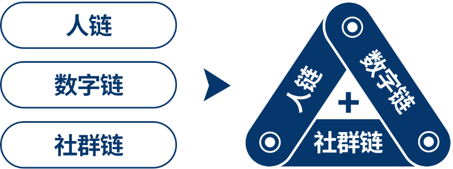 过去的渠道链,有信息链、资金链、物流链,现在又增加了新三链:人链、数字链和社群链。每个链都能够与其他三链组合,从而增强渠道驱动力。
