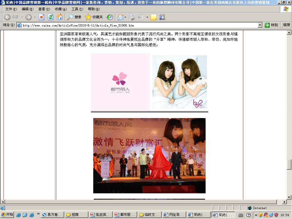 都市丽人结合品牌核心价值,在代言人的选择上也有着令人耳目一新的感觉。都市丽人选择的代言人为超人气组合BY2。BY2为双胞胎姐妹,是豆蔻年华的花季少女,其演艺才能和靓丽形象代表了流行风尚之美。两个形影不离相互偎依的女孩形象与强调亲和力的品牌文化合而为一,十分传神地展现出品牌的“分享”精神,传递都市丽人亲和、亲切、宛如好姐妹般贴心的气质,充分演绎出品牌的时尚气息与国际化感觉。如图12-12所示。