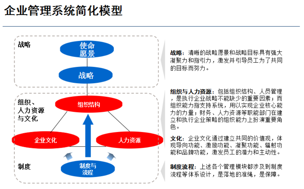 我们用这张图描述复杂的企业管理,就可以非常形象地把企业管理的几件事:战略、组织、人力资源、企业文化之间的关系表示出来。