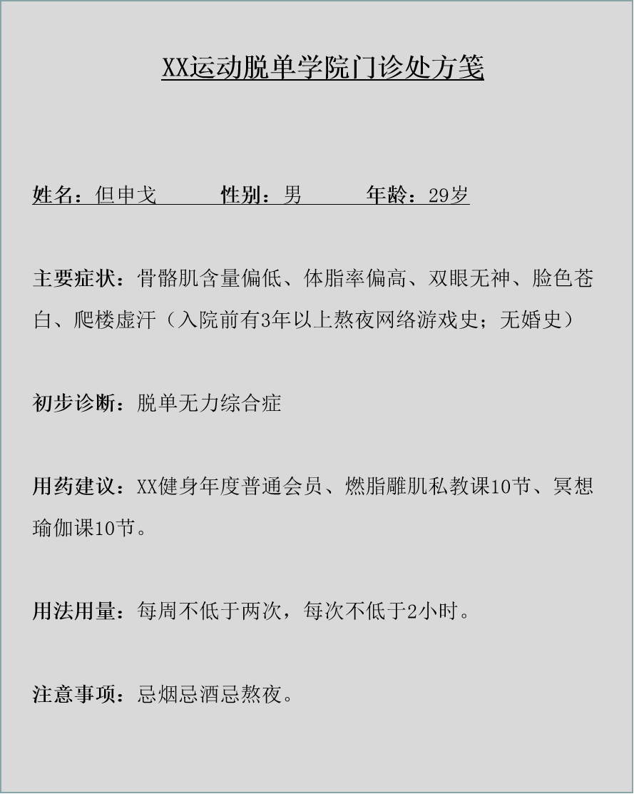 提示:下列“城市英雄”健身俱乐部的“处方式”广告文案,举一反三也可用于餐饮(吃货症候群)、汽车保养(类车甲亢症)、美容会所(皮肤饥渴症)等。