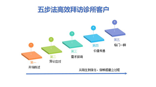 专业化学术拜访的五步法是:开场陈述、异议应对、需求探询、价值传递、临门一脚。如图7-2所示。