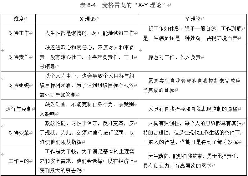 1957 年,道格拉斯·麦格雷戈在其所著《企业的人性面》(The Human Side of Enterprise)一书中提出 X-Y 理论。X 理论认为人们有消极的工作原动力,而 Y 理论则认为人们有积极的工作原动力,这是一套基于两种完全相反假设的理论,具体如表 8-4 所示。