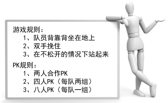 图6-3的“人山人海”游戏体现了互相支持的意义,当两个人背靠背坐下后,很难起来。很多人只想自己,想要自己先起来,然后去带动另外一个(如图6-4所示),其实这样是不科学也不现实的。最容易的方法是大家相互支持,用背部的力量去顶对方,这样形成一个支点,通过两腿的力量加上第三个支点把两个人带动起来,再多的人,原理是一样的,只是需要团队统一的命令和统一的配合,不然很难快速起来。