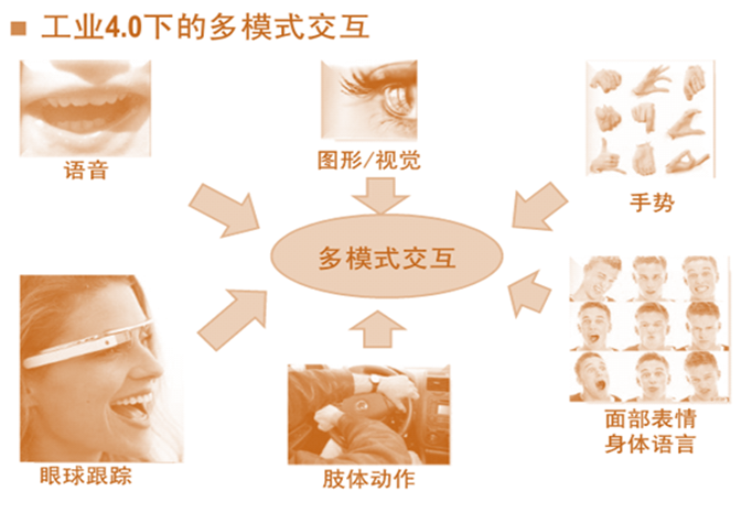 另外,在工业4.0场景之下,多模式交互的也十分重要,用途广泛。在人与机器的交流中,比如在数据输入中,在工作记录中等,除了键盘输入,还应该有其他交互模式,比如语音输入和识别技术、眼球跟踪技术、人体动态识别和记忆技术、面部表情判别技术等。类似这些多模式的交互技术在智能化制造时代都将有很大的应用价值,比方说在客户服务过程中,表情识别技术能准确识别客户的心理反应,在处理客户投诉过程中,利用语音系统准确记录工作场景。环比如在无人驾驶汽车和无人驾驶飞机的研制中,多模式交互系统更能配上用场。在工业制造智能化的过程中,多模式交互技术的研发和应用是另一个热门行业,其中蕴藏着巨大的商机。