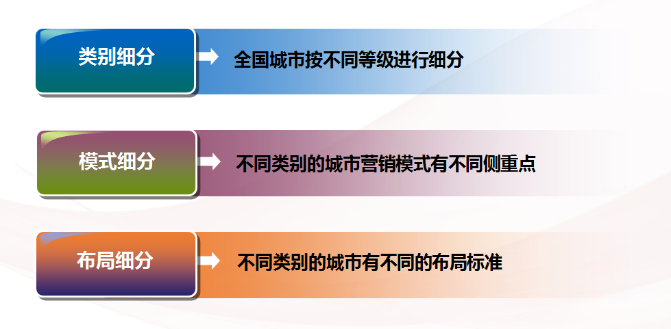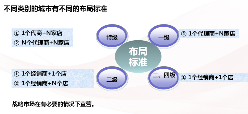 不同市场要有不同的布局标准与策略,这样就会更科学地指导企业招商部门进行合理的招商,也能指导经销商合理地在当地进行规划布局。