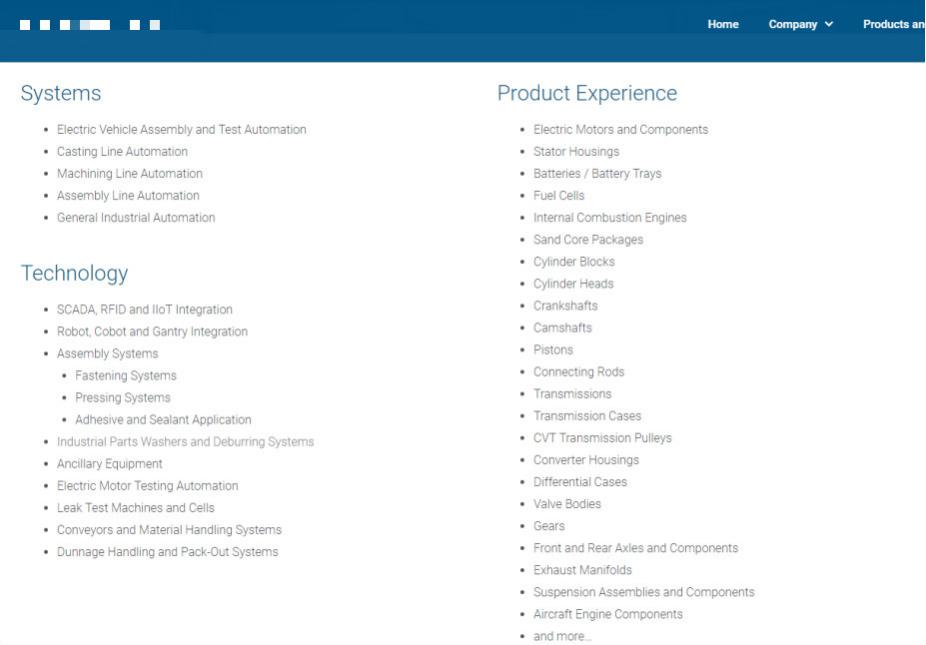 可想而知,这种情况下其实并没有任何现成设备可以做“产品”来直接卖。这家公司在产品目录中展示的,其实只能算是一些他们曾经做过的设备,作为例子展示给潜在买家看,实际合作时都是要重新定制的。这种“定制”虽然看起来自由度非常高,但毕竟并不是什么产品都能做。如果只用“自动装配系统(Automated Assembly System)”或“特殊目的设备(Special Purpose Machine, SPM)”这种大而化之的产品词来做概括,未免不够精准;做过的例子当然更具体,也可以无穷无尽地举,但又未免太过分散。因此,如果我们现在要重新设计这家公司的信息架构,除了上面说的这两方面外,还需要找到一个更加明确的方式来限定和聚焦产品,那就是设备的构成部分。