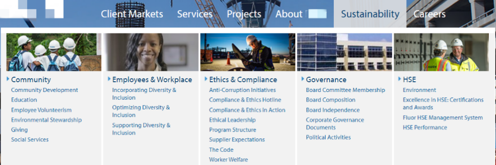 d)​ 对于规模更大、要求更高的项目,如EPC工程承包,那么需要展示的内容就更加多面,层次也更高。比如健康、安全与环境(HSE/Health, Safety and Environment),企业社会责任(CSR/Corporate Social Responsibility),道德与合规(EthicsandCompliance),在一些大型工程商的网站上,常常都是作为主要导航栏目来展示的。他们会从国际认证证书、管理层履历、内部反腐败措施、员工职业发展规划、曾参与的社会公益活动等各方面,向潜在客户展示自己是多么可靠、可信。
