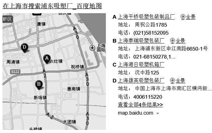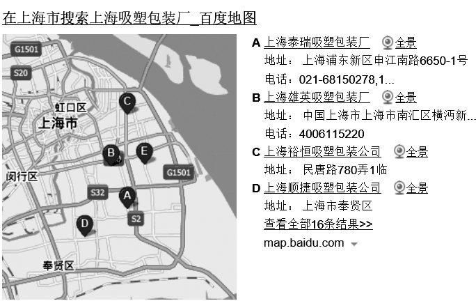 图1-2 在百度搜索“上海吸塑包装厂”的搜索结果首页地图展现效果