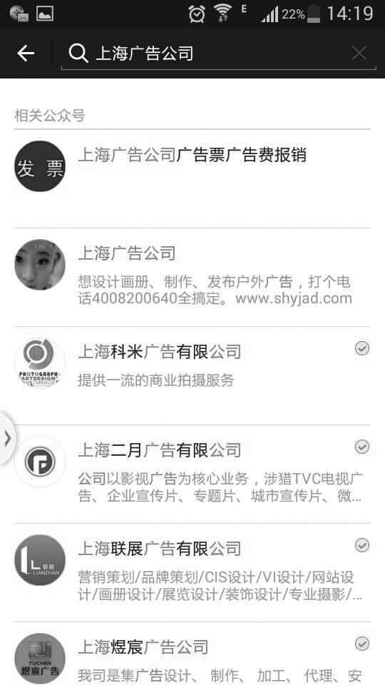 图1-3 在微信公众号里搜索“上海广告公司”的搜索结果首屏展现效果
