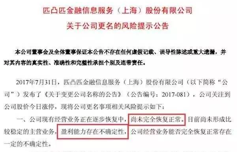 但笔者在这里想提醒读者的是:公司改名就一定灵吗?改名为高科技企业就真有技术含量了吗?如果真的这么简单,企业经营的核心竞争力只是起个好名字而已。而现实中“顺势”改名的事情还真不少,众所周知有一个上市公司直接改名叫匹凸匹股份有限公司,后来结果却与其预期大相径庭。如图2-1所示。